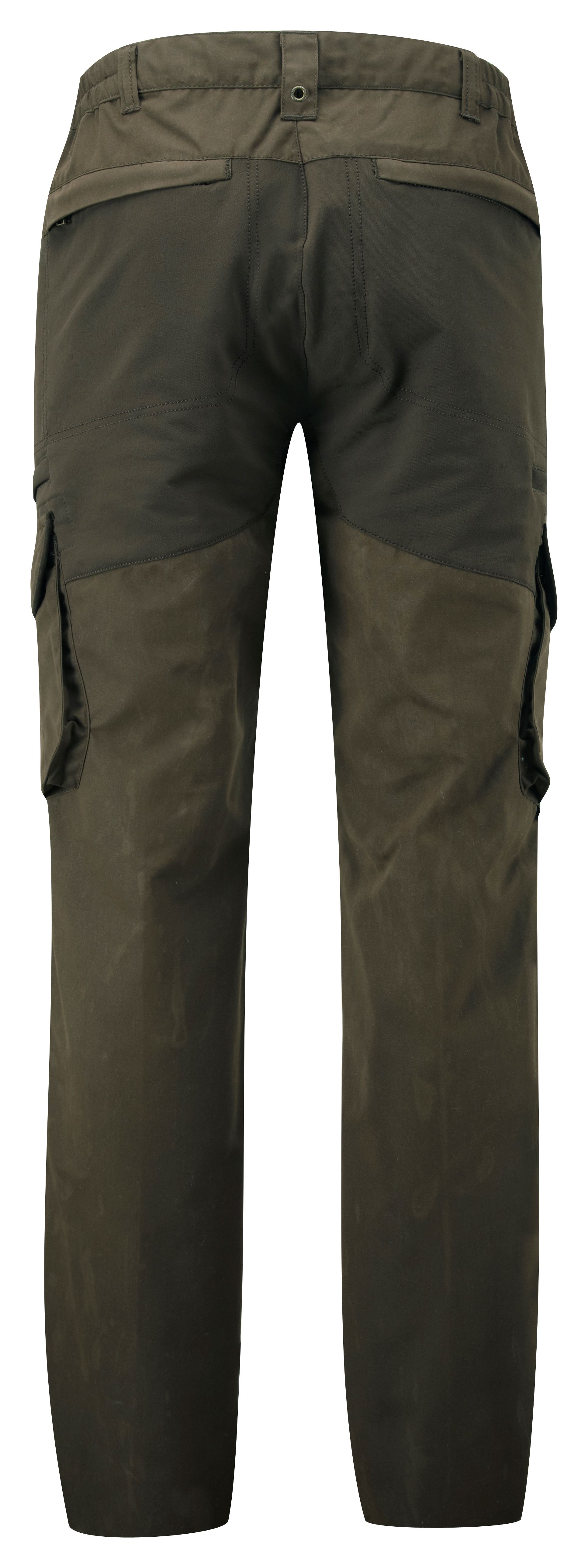 2 large cargo pockets with pleats and pop-button flaps on each leg, knife pocket on right leg, pocket with zip on left leg, 2 open hip pockets with suede trim and 2 back pockets.